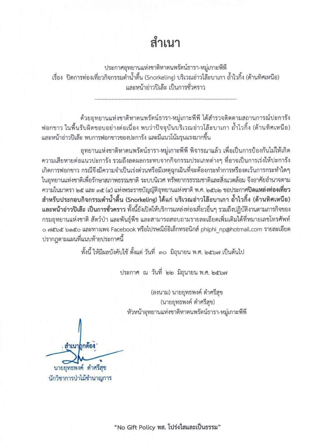 อุทยานแห่งชาติหาดนพรัตน์ธารา-หมู่เกาะพีพี จังหวัดกระบี่ ได้ออกประกาศปิดจุดดำน้ำตื้นชั่วคราวบริเวณ อ่าวโล๊ะบาเกา, ถ้ำไวกิ้ง (ด้านทิศเหนือ) และหน้าอ่าวปิเล๊ะ รอบเกาะพีพี หลังจากการสำรวจพบแนวปะการังเจอวิกฤติปะการังฟอกขาวรุนแรงขึ้น จนขาวโพลนไปทั่ว
